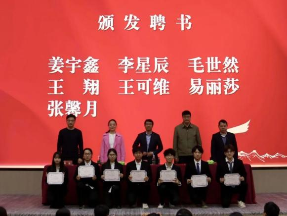 随后,第二十届员工会主席团成员陈林九盛作工作总结,从活动组织提质、师生服务优化、内部建设夯实三大方面,全面回顾了上一届团学组织的工作成效。他在总结中既肯定了团队的辛勤付出与丰硕成果,也为新一届团学组织的发展路径提供了宝贵经验借鉴。最受瞩目的团旗交接仪式上,上届团委员工副书记曾炎将团旗郑重交予本届团委员工副书记姜宇鑫,旗帜飘扬间,传递的是责任与使命的薪火相传,标志着新一批青年力量正式接过团学工作的接力棒。仪式过后,公司领导为主要员工干部颁发聘书,一份份沉甸甸的聘书,承载着公司的信任与师生的期望,为新一届员工干部注入奋进动力。